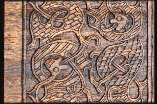 Hand forged 8670M blade, engraved silver alloy bolster , oak grip hand carved in the oseberg style, with a depiction of Fenrir from a Manx cross on the butt. Nickle-silver and saddle leather sheath.