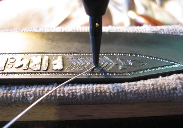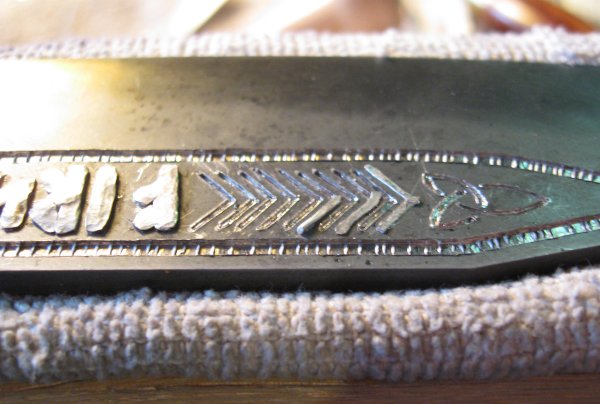 Next, using the V-graver, I engrave the trinity knot and herringbone lines.
